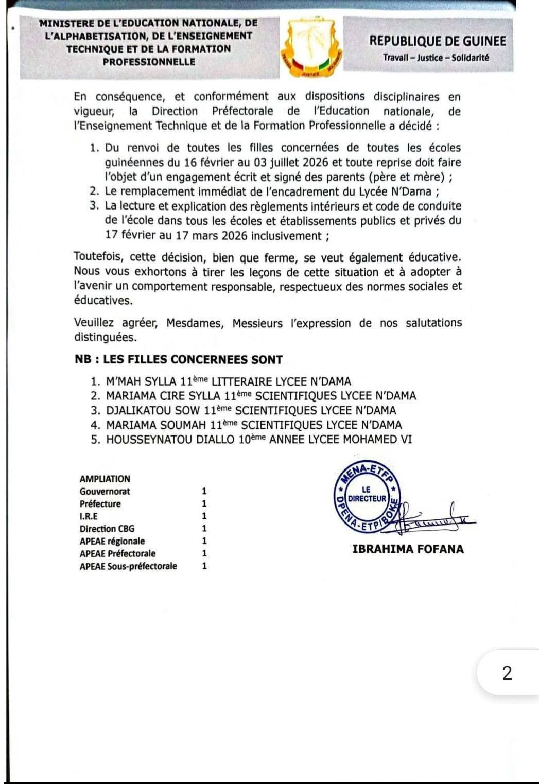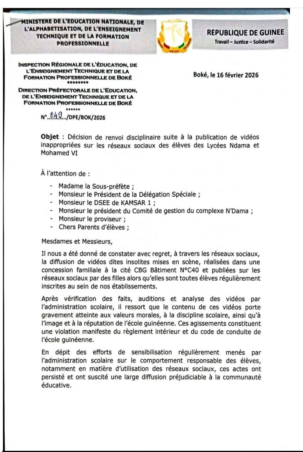 En dépit des excuses sous fond de larmes que beaucoup d’observateurs avaient qualifiées de crocodiles, des voix ont continué à dénoncer cette sortie qui heurte les valeurs et les moeurs de la société surtout de l’école. Le DPE de Boké de décide de frapper fort. Elles sont toutes renvoyées de l’école à compter du 16 février jusqu’au 3 juillet 2026 soit pour le reste de l’année. Dommage, peut-on dire surtout pour la jeune Housseinatou Diallo qui doit passer le BEPC cette année. Un gâchis, excusez du peu!